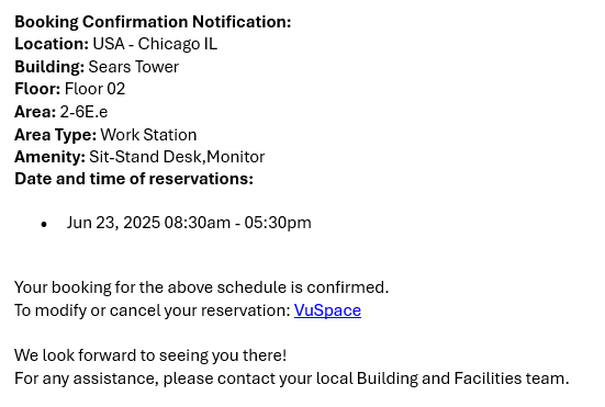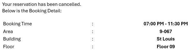- When enabled, if you don't check-in before the time is up, you will get notified that your booking was cancelled. The email subject will be "VuSpace Booking Cancellation Notification" and will look similar to this and include your booking reservation details: