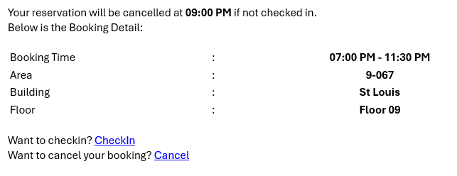- If enabled, you may get notified before a booking is cancelled to remind you to check-in. The email subject will be "VuSpace Booking Cancellation Reminder Notification" and will look similar to this and include your booking reservation details: